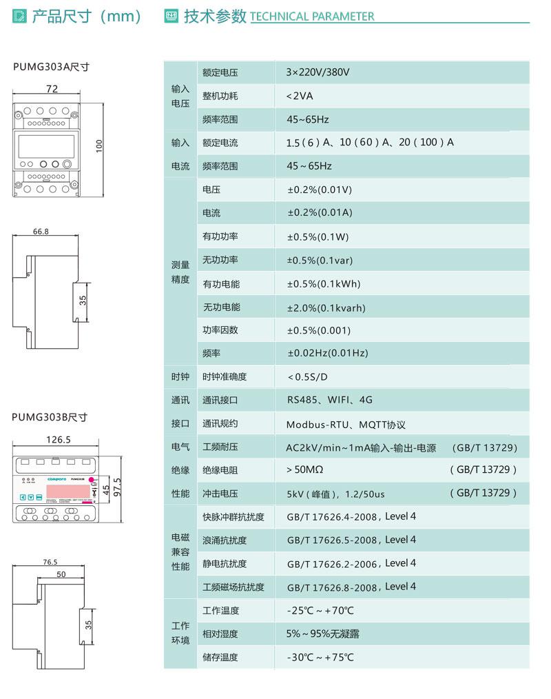 PUMG303三相導(dǎo)軌式智能電能表采用DIN35mm導(dǎo)軌式安裝結(jié)構(gòu)、LCD顯示,測量電能及其它電參量,可進(jìn)行時鐘、費(fèi)率時段等參數(shù)設(shè)置,并具有電能脈沖輸出功能;可用RS485通訊接口與上位機(jī)實(shí)現(xiàn)數(shù)據(jù)交換。該電能表具有體積小巧、精度高、可靠性好、安裝方便等優(yōu)點(diǎn),性能指標(biāo)符合國標(biāo)GB/T17215-2002、GB/T17883-199和電力行業(yè)標(biāo)準(zhǔn)DL/T614-2007對電能表的各項(xiàng)技術(shù)要求,適用于政府機(jī)關(guān)和大型公建中對電能的分項(xiàng)計(jì)量,也可用于企/事業(yè)單位作電能管理考核。