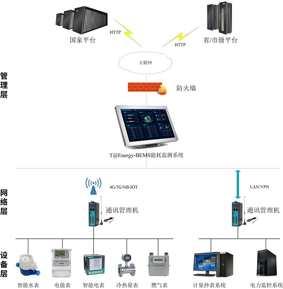 設(shè)備層:主要由電能表、水表、燃?xì)獗?、冷熱量、蒸汽表以及第三方監(jiān)測系統(tǒng)組成。